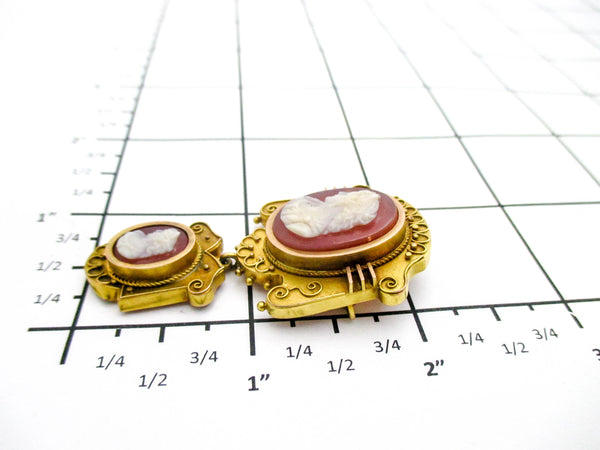 This is an absolutely beautiful piece of Victoriana jewelry. The Cameos are carved from hardstone and you can tell from the pictures just how intricate the Lady carvings actually are. The pendant is made in the late 1800s and is Victorian 10K Gold.