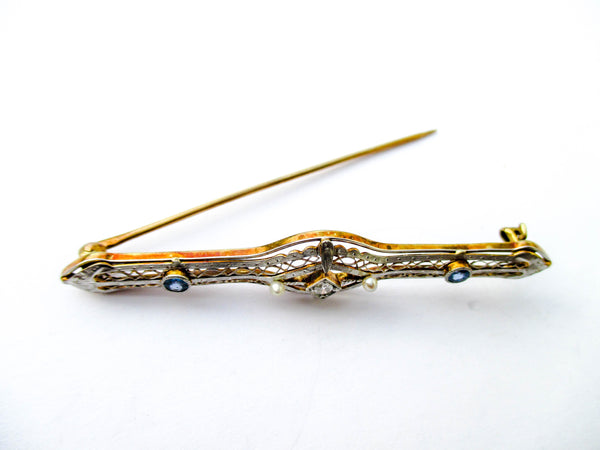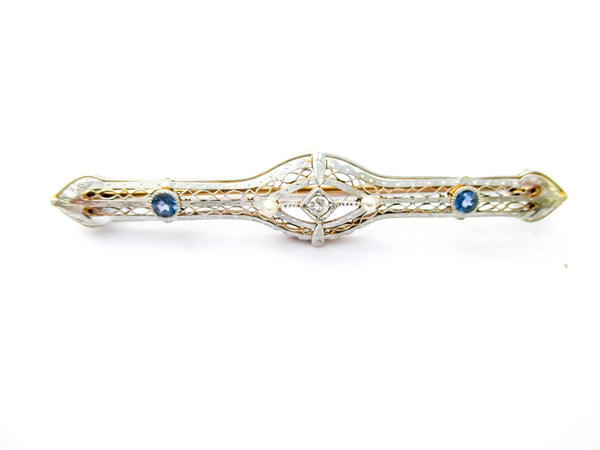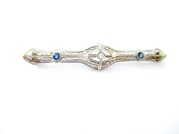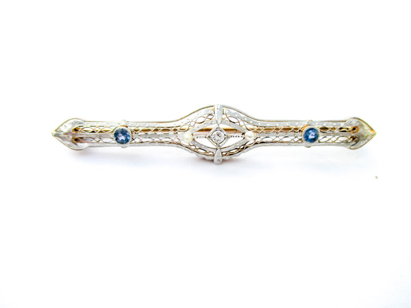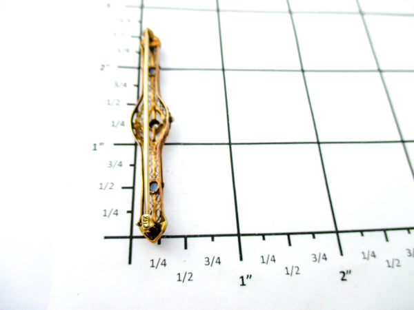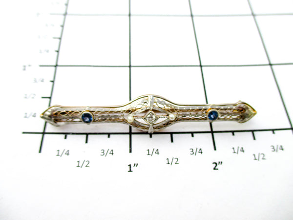 The Edwardian period was full of style that extended well past King Edwards passing. This pin sports the open hand pierced style and has a centerpiece of a diamond or possibly moissanite gemstone which is flanked by 2 sapphires. Both the gold and gemstones have been tested and we use the Presidium II gem tester.