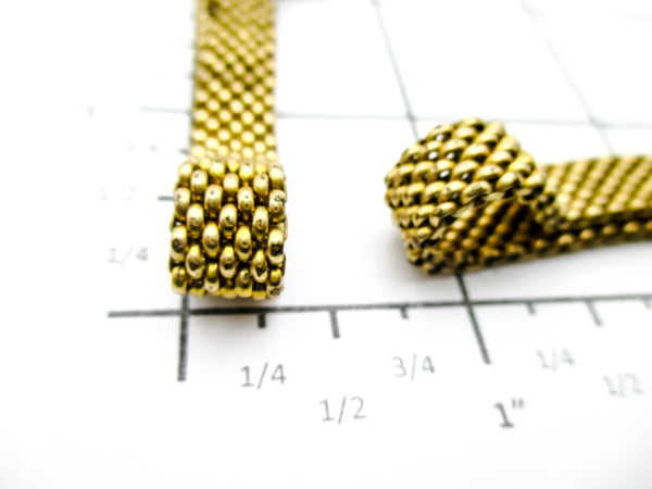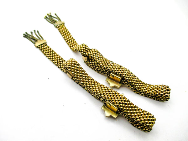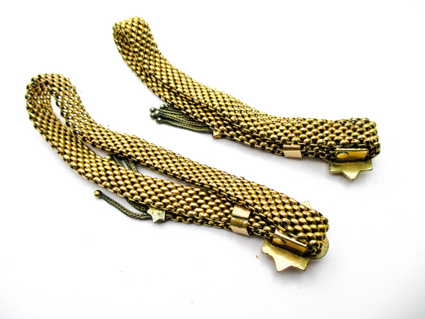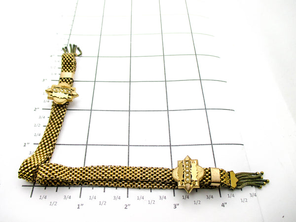 This exquisite Victorian bracelet set features beautiful gold filled mesh chains with an adjustable slide and delicate tassels. The centerpiece of this antique piece is a stunning line of seed pearl adorning the garter slides, adding a touch of elegance to any occasion. Perfect for Mother's Day, weddings, anniversaries, Valentine's Day, or any special event, this bracelet set is a one-of-a-kind fashion statement. The intricate engraving and bezel setting add to the unique charm of this vintage piece, which dates back to the 1870s.