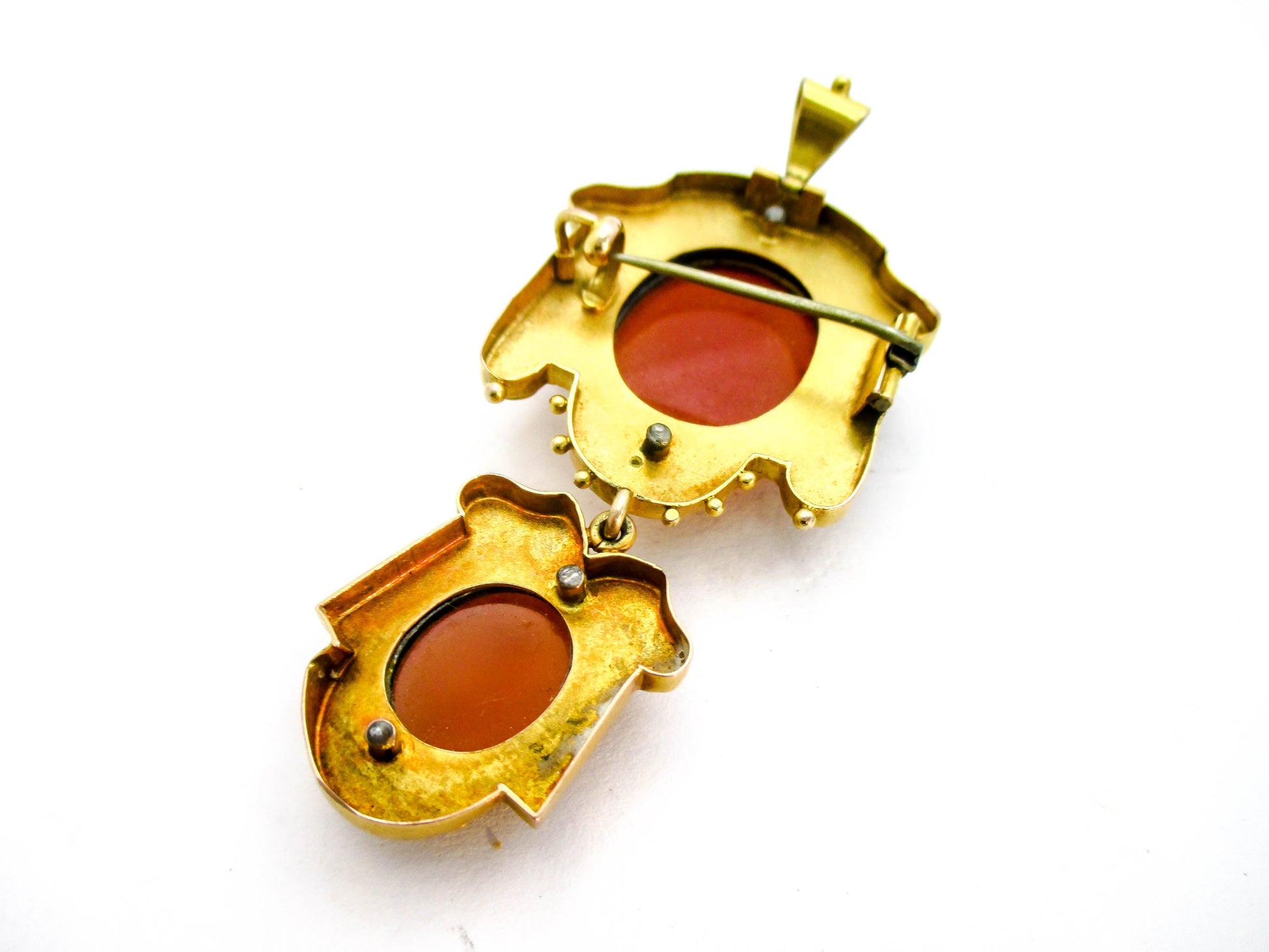 This is an absolutely beautiful piece of Victoriana jewelry. The Cameos are carved from hardstone and you can tell from the pictures just how intricate the Lady carvings actually are. The pendant is made in the late 1800s and is Victorian 10K Gold.